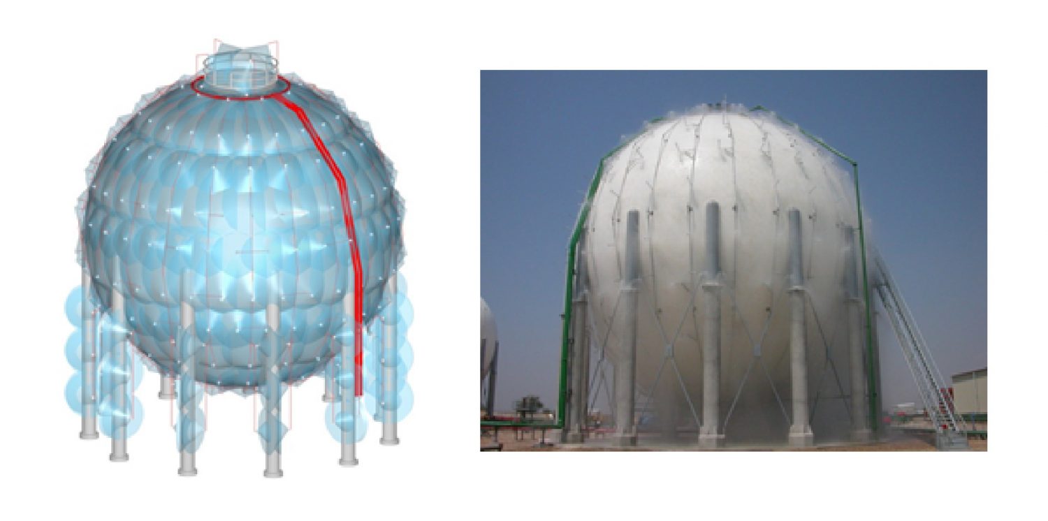 S.L. como empresa instaladora del sistema, dispone de todos los modelos de fundición, instrucciones de aplicación, experiencia de diseño y montaje que permite conseguir un sistema modular, sencillo, compacto y seguro para la protección contra incendios de recipientes esféricos del tipo utilizado en almacenamientos de LPG en recintos químicos y petroquímicos.