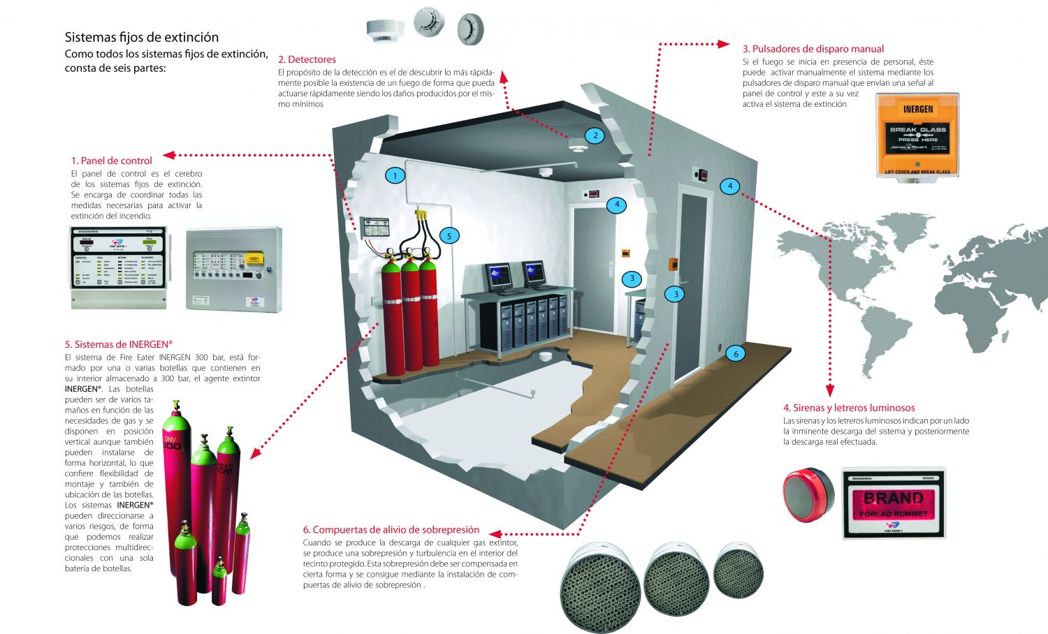 Teniendo en cuenta que el INERGEN® es un agente limpio que no daña los bienes materiales, y que es seguro para las personas (permite respirar), es particularmente adecuado para la protección de áreas donde el incendio podria ocasionar grandes pérdidas económicas o de valor intrínseco, tales como: